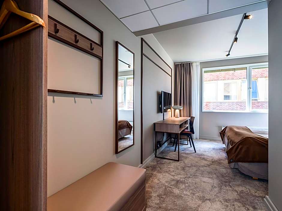 The single room offers air conditioning, a desk and a chair, a refrigerator, an iron, a wardrobe as well as a private bathroom boasting a bath or a shower and a hairdryer. This single room has parquet floors, heating and a flat-screen TV. The unit has 1 bed. There is no possibillity to open the windows at Compact rooms. The rooms are facing towards the indoor restaurant.